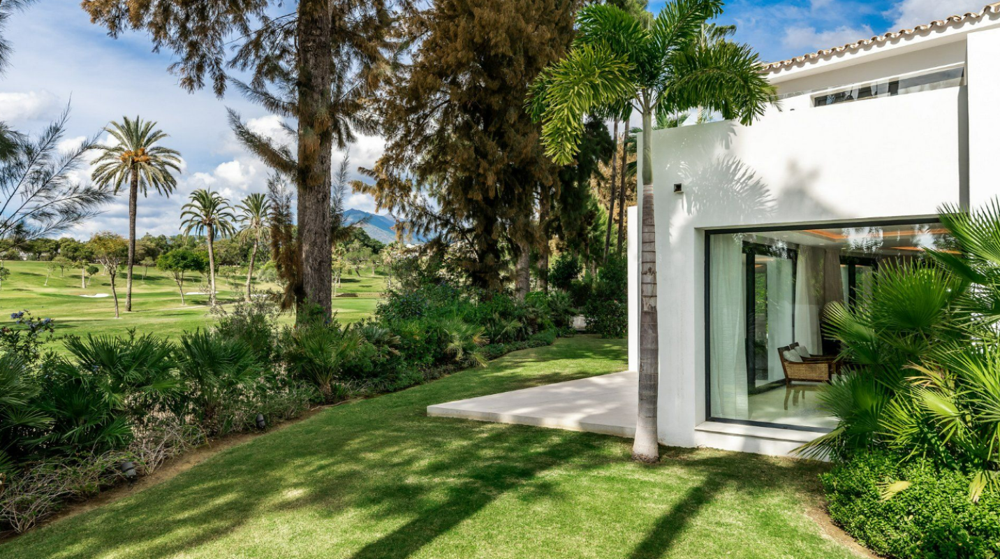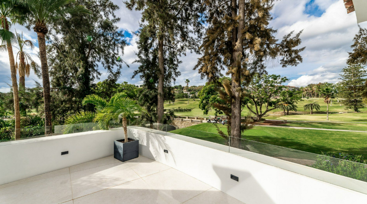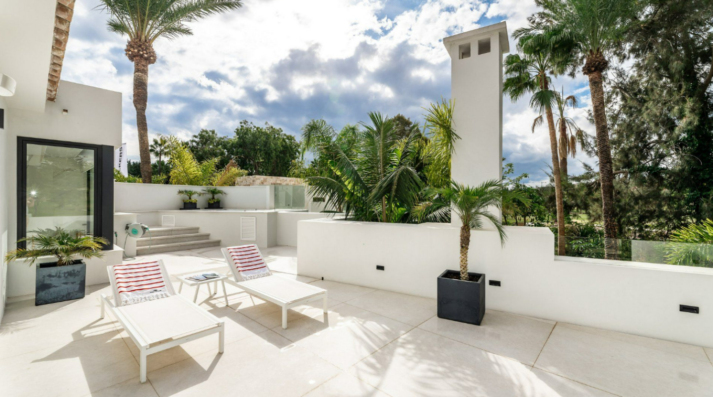 A majestic and contemporary villa situated in the heart of Nueva Andalucia Golf Valley with south-west orientation, resting frontline to one of Spain´s most exclusive and members-only golf courses, Las Brisas, with stunning views across the mature gardens, olive trees and the golf course. The architecture is contemporary yet timeless and built over three floors, offering a modern luxury living atmosphere with elegant interior design with a warm touch. The property has 5 bedrooms plus 5 bathrooms and a guest toilet. It offers spacious open plan living areas and beautifully styled bedrooms. The open kitchen is fully equipped and custom- made with highest standards. Enjoy direct views to the golf course from any place in the house. The terrace on the upper floor with sun beds and hot tub is ideal to enjoy the spectacular views. Outside there is a magnificent heated pool and a beautiful tropical garden. The villa includes a carport with space for several cars. This villa has everything for modern-day living; contemporary design and style, set in an enviable location!