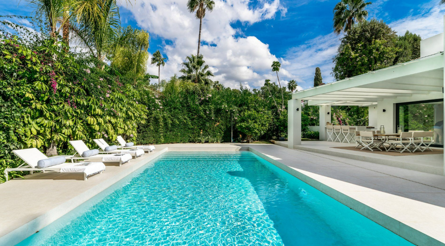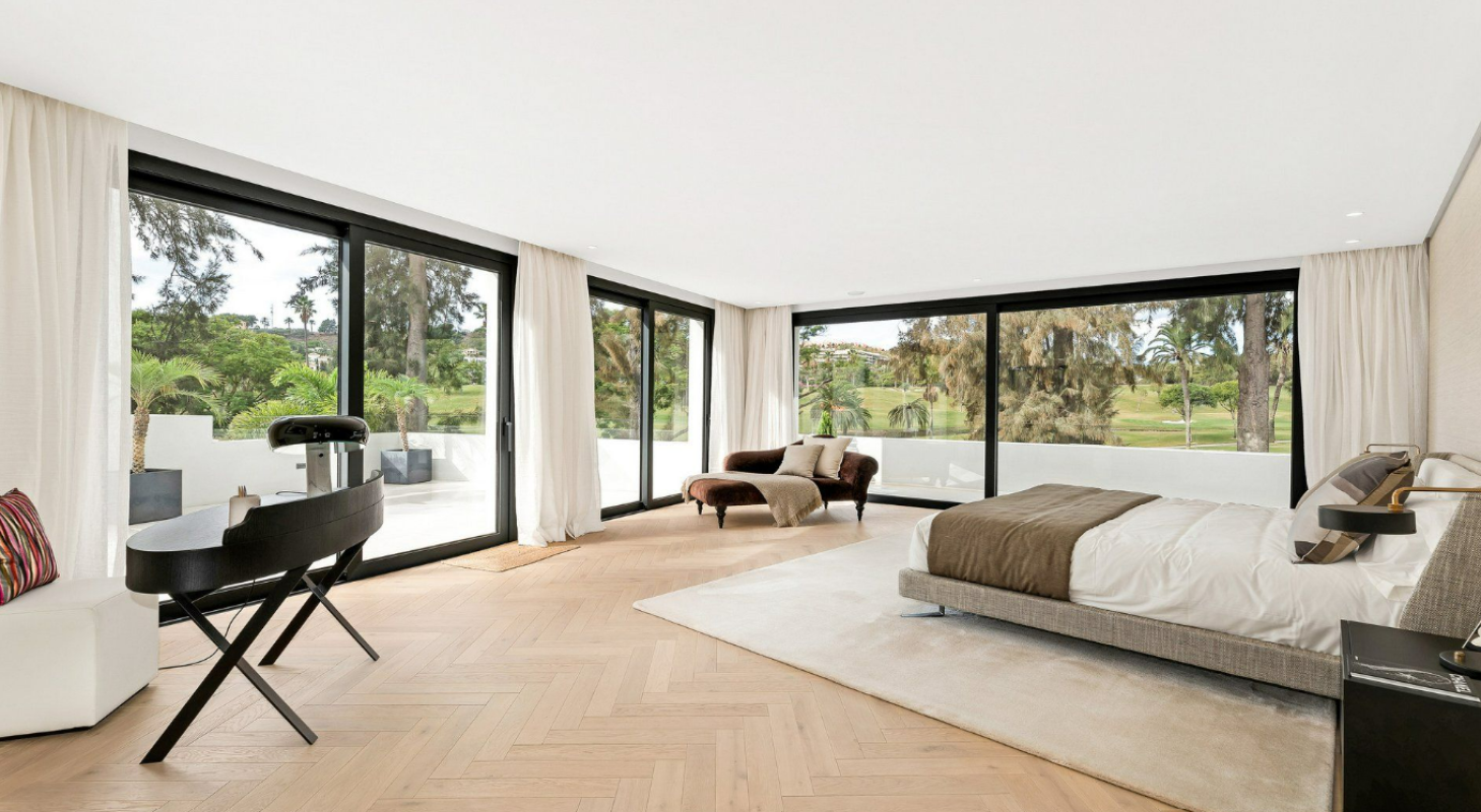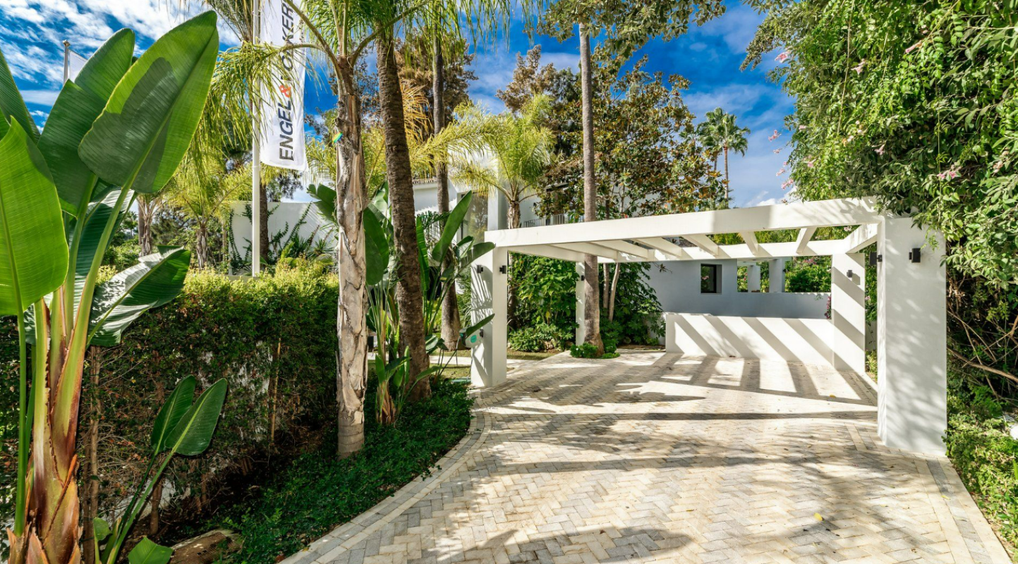 A majestic and contemporary villa situated in the heart of Nueva Andalucia Golf Valley with south-west orientation, resting frontline to one of Spain´s most exclusive and members-only golf courses, Las Brisas, with stunning views across the mature gardens, olive trees and the golf course. The architecture is contemporary yet timeless and built over three floors, offering a modern luxury living atmosphere with elegant interior design with a warm touch. The property has 5 bedrooms plus 5 bathrooms and a guest toilet. It offers spacious open plan living areas and beautifully styled bedrooms. The open kitchen is fully equipped and custom- made with highest standards. Enjoy direct views to the golf course from any place in the house. The terrace on the upper floor with sun beds and hot tub is ideal to enjoy the spectacular views. Outside there is a magnificent heated pool and a beautiful tropical garden. The villa includes a carport with space for several cars. This villa has everything for modern-day living; contemporary design and style, set in an enviable location!