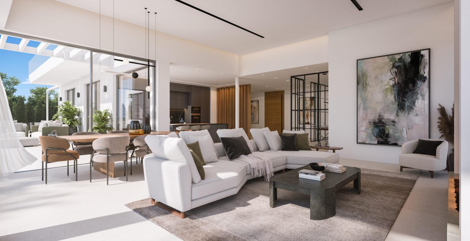 New beautiful contemporary style villa located next to El Paraiso Golf Club, in a cosy and quiet residential area, with South orientation and built on a large flat plot of 2,100 m2. The villa is close to all kinds of services and amenities, with the golf course and the beach within a short distance and with luxury finishes such as underfloor heating, aerothermia, domotic system and landscaping.Ground floor you find the bedrooms suite, modern open plan kitchen and a guest toilet. On the first floor you have the huge master bedroom with beautiful open plan bathroom, big dressing room and private terrace. The 96 m2 basement include a private parking for 2 cars and a big area to be finished according to your family needs: extra bedrooms, games room, wine cellar, cinema room, etc. In addition the villa has a beautiful flat garden with private swimming pool and nice chill out area. Also, in the surroundings you find a new Tennis and paddle club.Currently under construction and with estimated delivery date by the end of 2021,