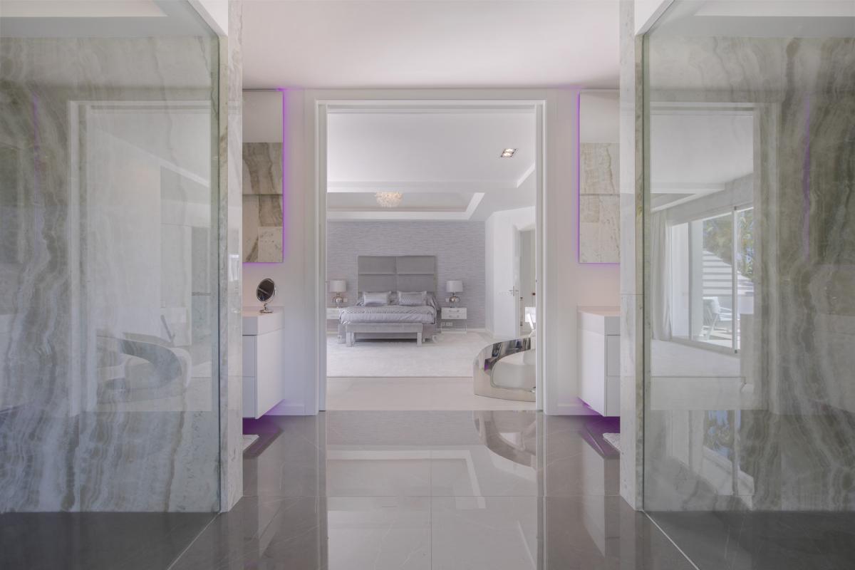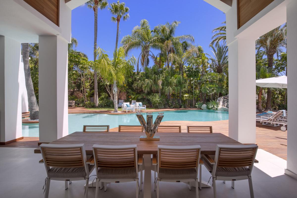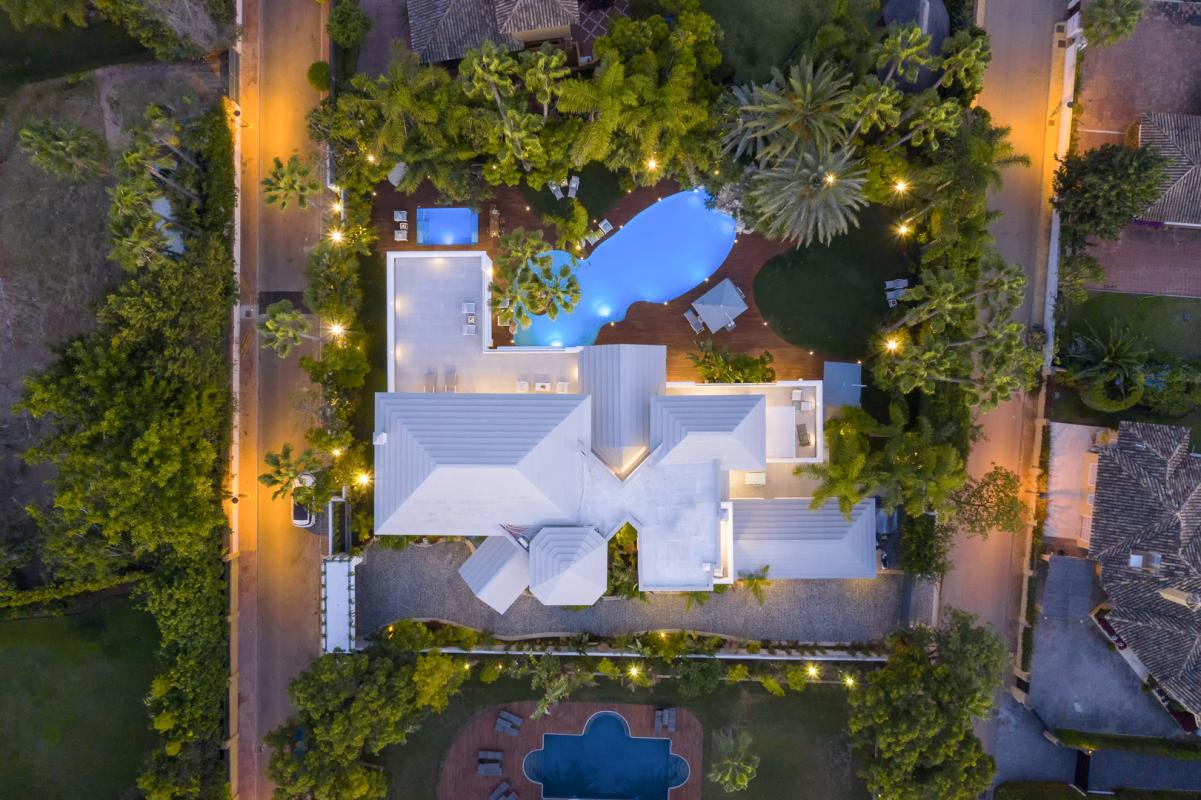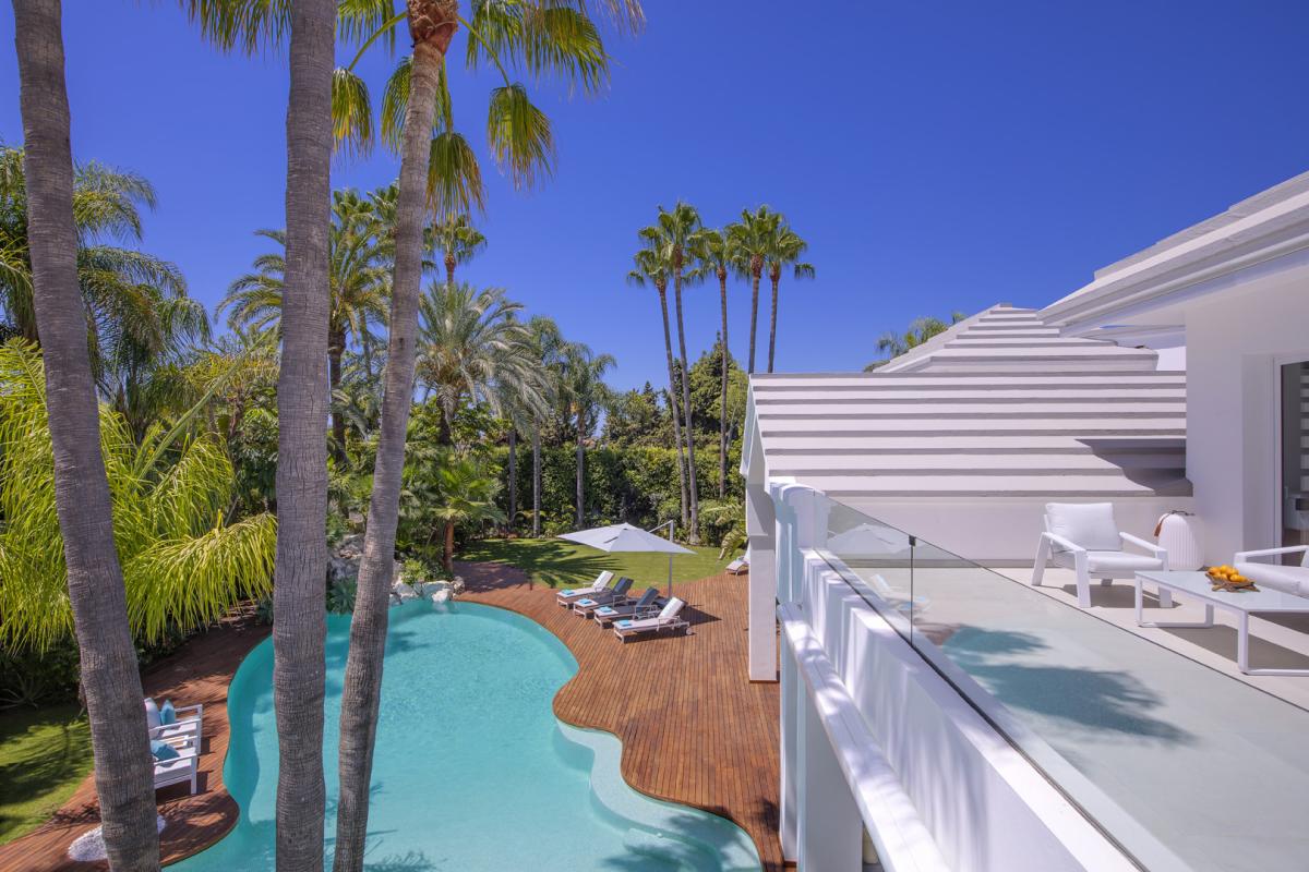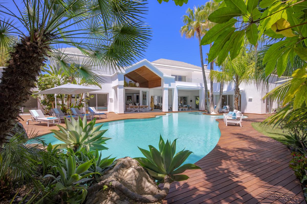 Once you cross the Iroko bridge under the double-height vaulted ceiling entrance over the organically shaped water feature an unusual big entrance door opens up into the OpenFlow entrance hall of the house, your attention will be drawn immediately to the double-height 7m ceiling with a glass upper gallery. The residence has a large and airy open plan area with fabulous natural light. A double-volume entrance leads to the spacious living and dining areas. A fully equipped kitchen is connected to the family room and access to an independent laundry room and garage. The ground floor consists of three bedrooms with en-suite bathrooms all with access to the tropical garden, a lagoon shape main swimming pool, and a second smaller heated pool with a Jacuzzi, ready to be enjoyed every day of the year. On the first floor, a double door to the east opens to the piece-de-resistance, the master bedroom suite. A wall to wall full height sliding door opens up to a huge private terrace with a master view of the pool and garden. Inside, separated by double sliding doors from the bedroom, the master bathroom, his and hers Onixwalking double showers, free-standing bath, and walk-in closets. On this floor, there are two additional en-suite bedrooms with private terraces and an office. The property is located in Guadalmina Baja in a secluded South facing plot with two private entrances, just a stroll away from the beach, schools, and shopping areas. The garden and large outdoor living areas of this mansion, make off this beautiful home, the perfect place to entertain family and friends