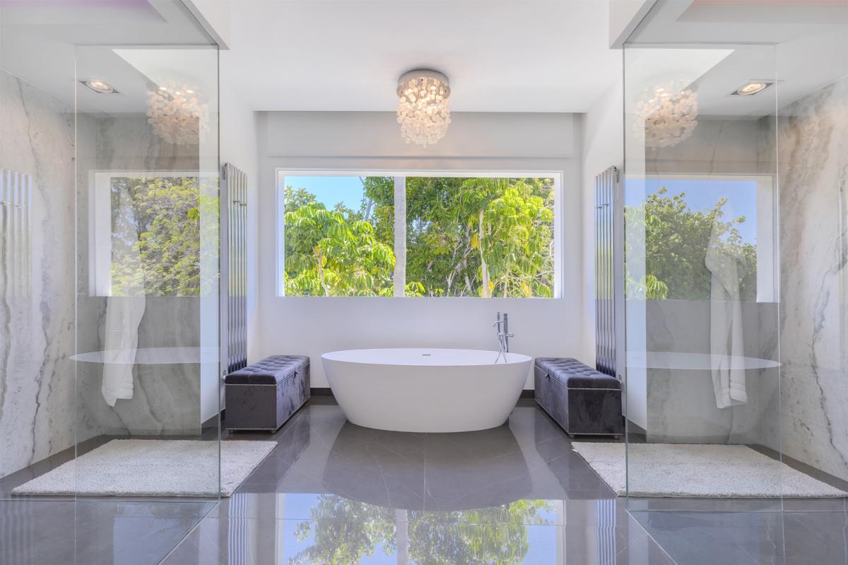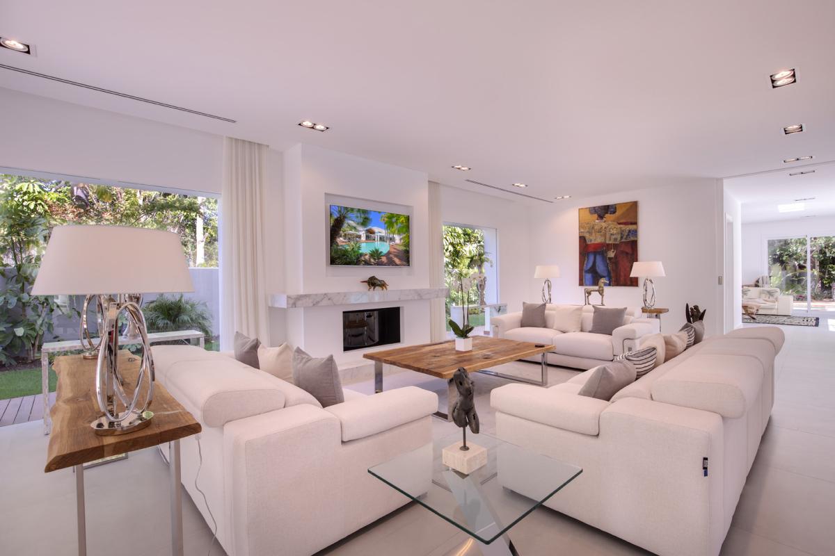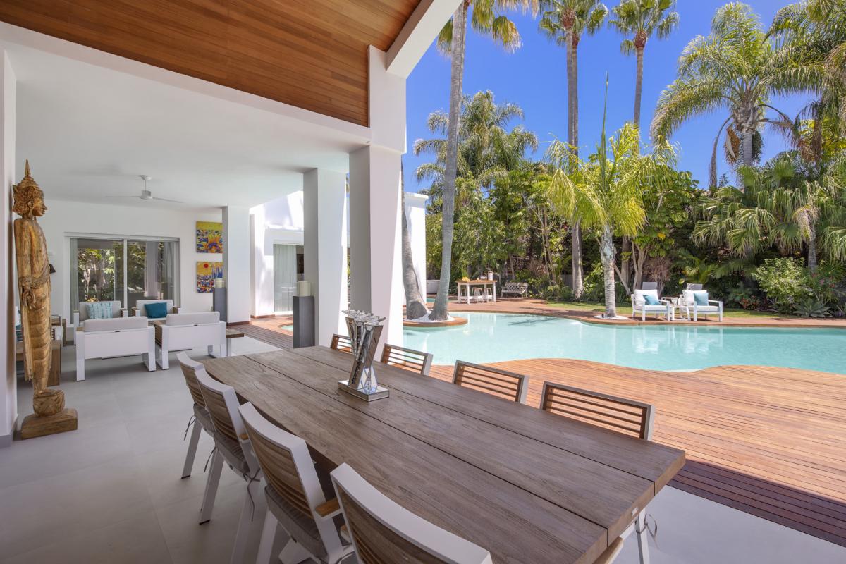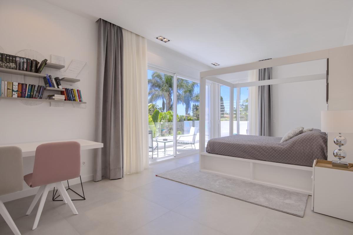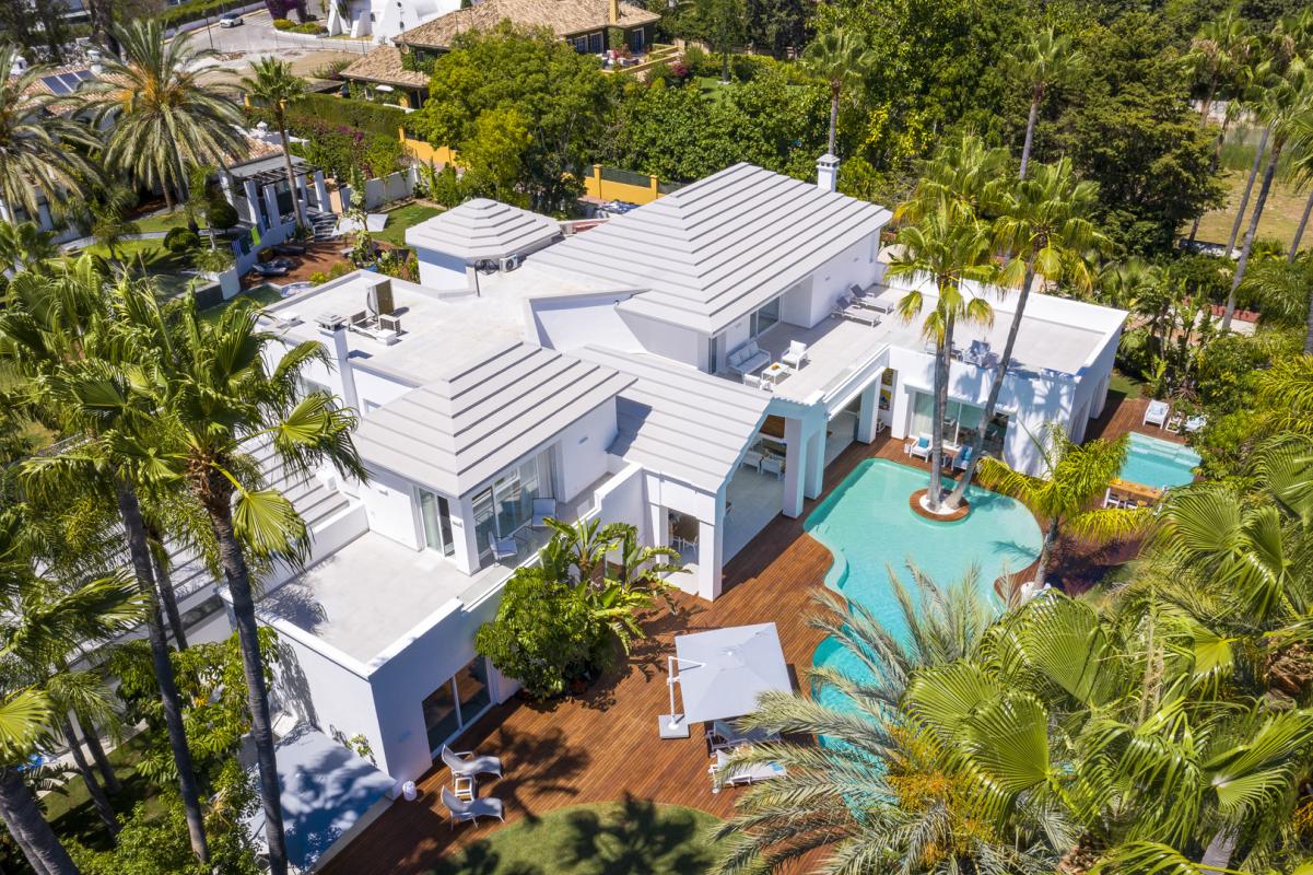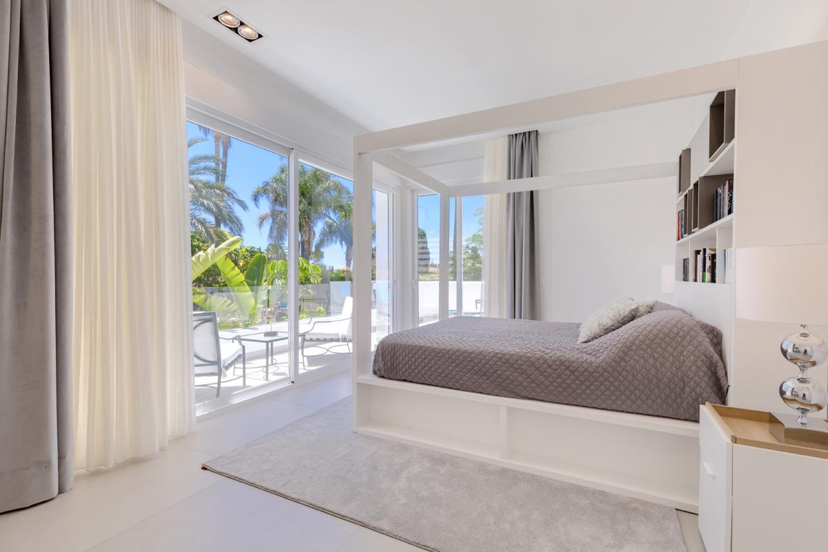 Once you cross the Iroko bridge under the double-height vaulted ceiling entrance over the organically shaped water feature an unusual big entrance door opens up into the OpenFlow entrance hall of the house, your attention will be drawn immediately to the double-height 7m ceiling with a glass upper gallery. The residence has a large and airy open plan area with fabulous natural light. A double-volume entrance leads to the spacious living and dining areas. A fully equipped kitchen is connected to the family room and access to an independent laundry room and garage. The ground floor consists of three bedrooms with en-suite bathrooms all with access to the tropical garden, a lagoon shape main swimming pool, and a second smaller heated pool with a Jacuzzi, ready to be enjoyed every day of the year. On the first floor, a double door to the east opens to the piece-de-resistance, the master bedroom suite. A wall to wall full height sliding door opens up to a huge private terrace with a master view of the pool and garden. Inside, separated by double sliding doors from the bedroom, the master bathroom, his and hers Onixwalking double showers, free-standing bath, and walk-in closets. On this floor, there are two additional en-suite bedrooms with private terraces and an office. The property is located in Guadalmina Baja in a secluded South facing plot with two private entrances, just a stroll away from the beach, schools, and shopping areas. The garden and large outdoor living areas of this mansion, make off this beautiful home, the perfect place to entertain family and friends