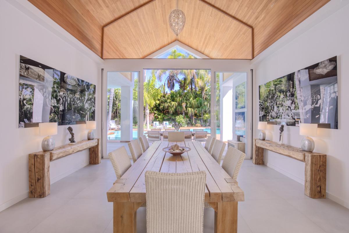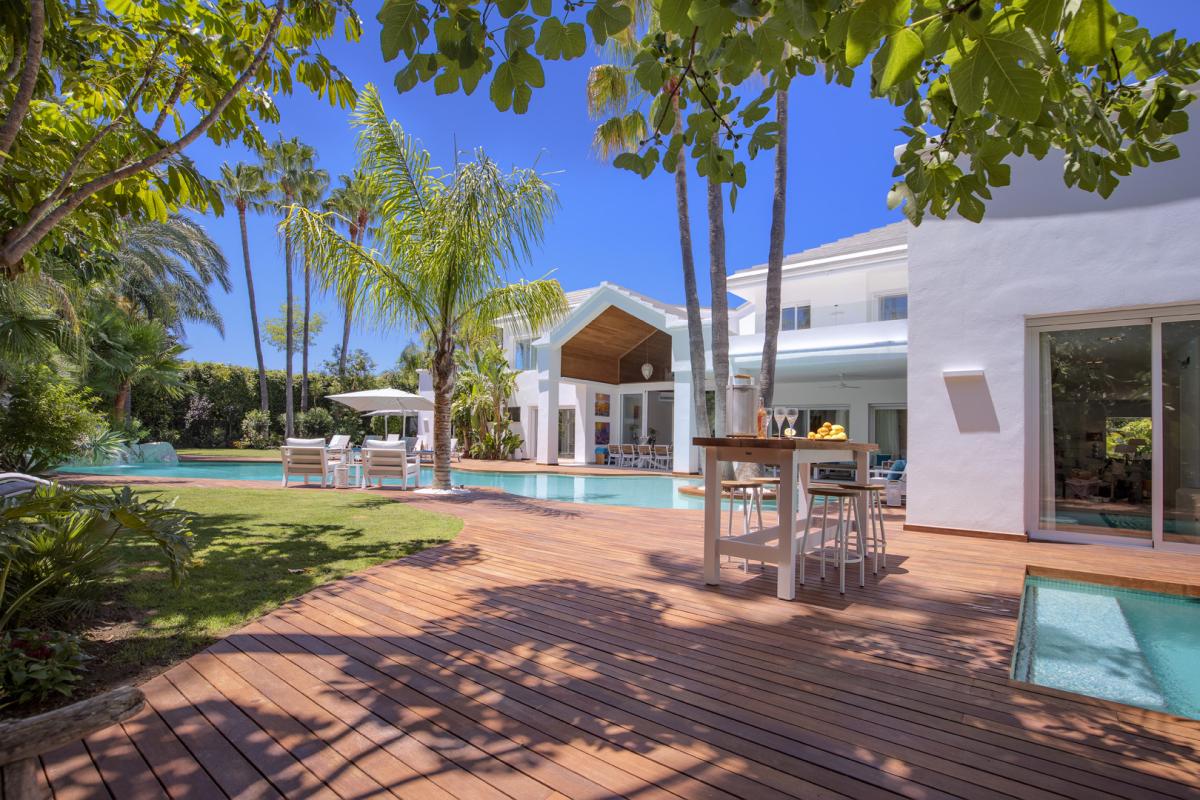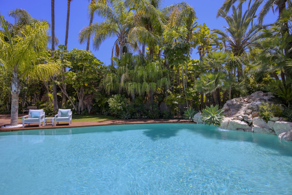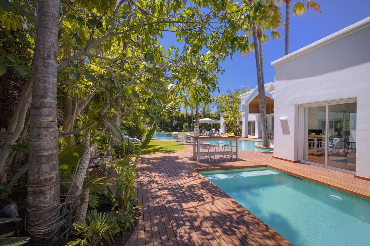 A secluded tropical oasis that starts to reveal itself once you pass through the impressive electric entrance gates. The Portuguese natural stone driveway adorned with tropical lush vegetation gives you the sensation that you have arrived at a home where no attention to detail was spared in its complete refurbishment to create a truly magnificent one-of-a-kind. This is not just another modern white box, nor is it a traditional Andalusian home but rather combines the very best of modern design with the warmth and texture of natural materials with extensive use of wood, plants, water features, glass, and stone to give a unique atmosphere unlike anything else in Guadalmina.