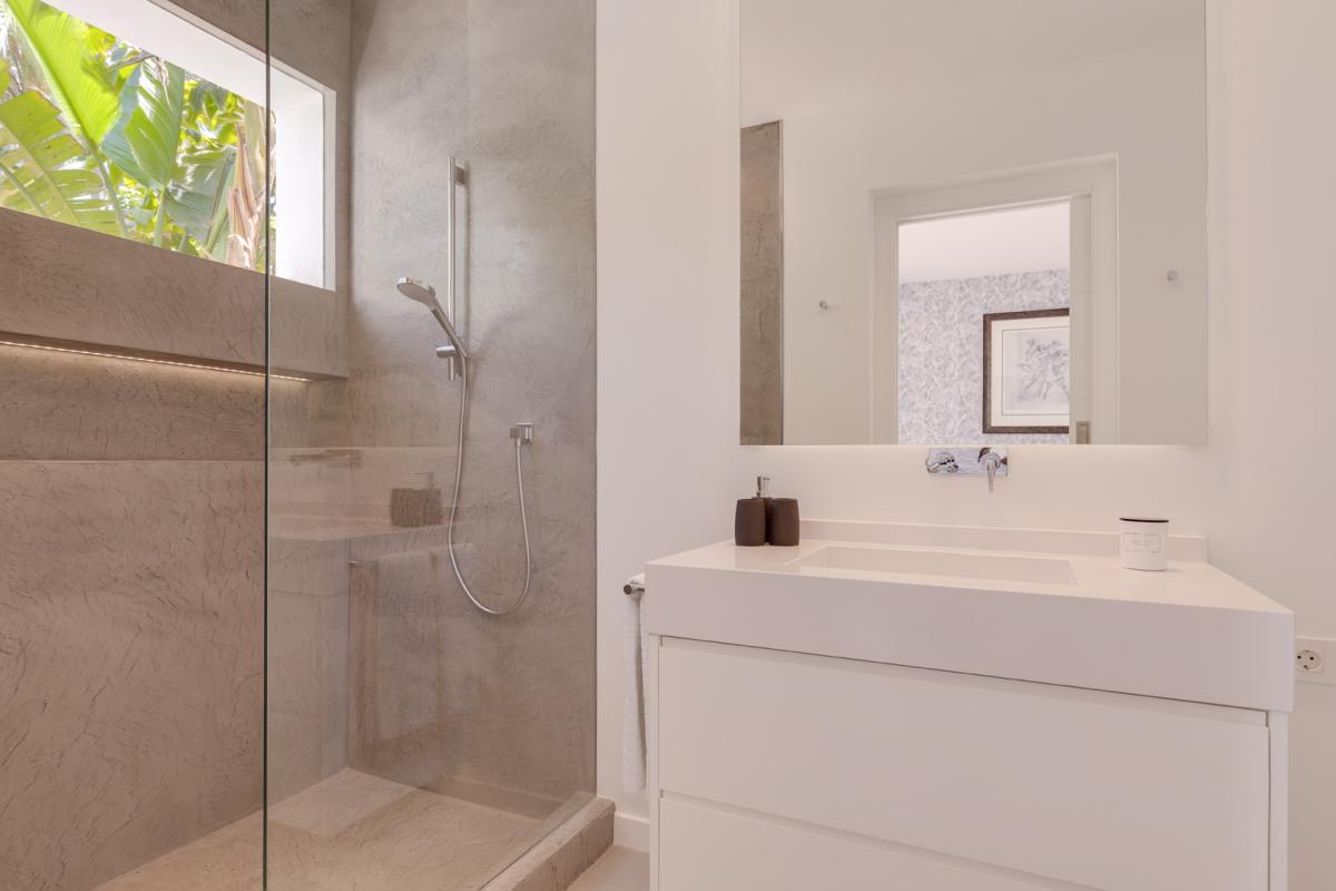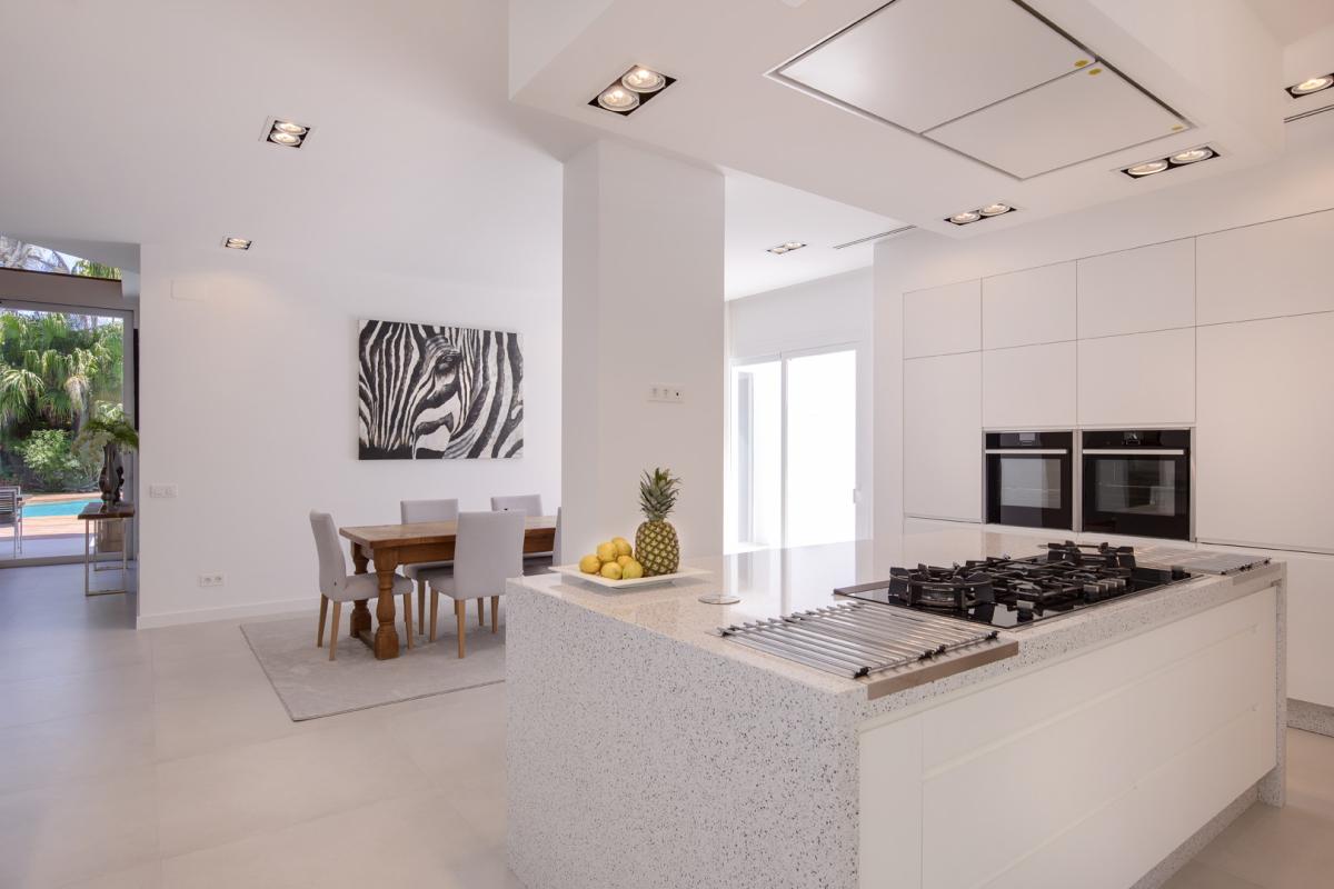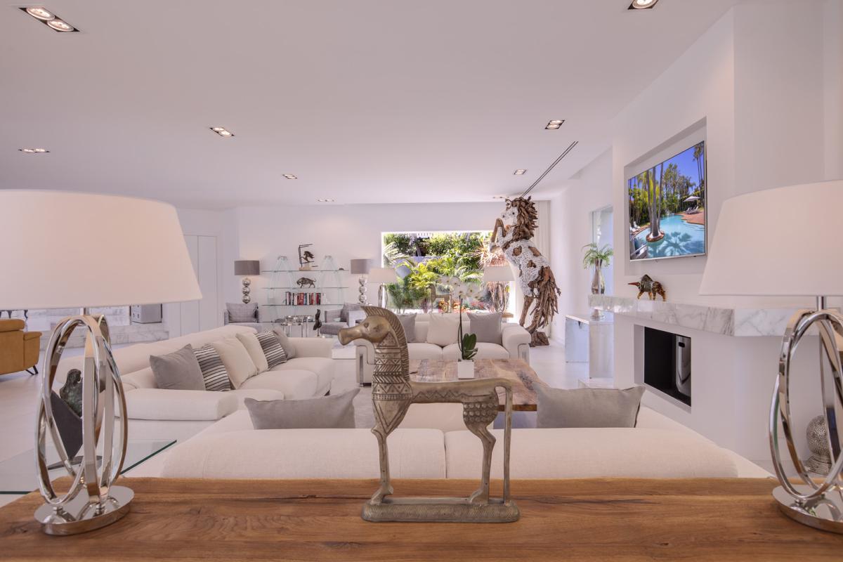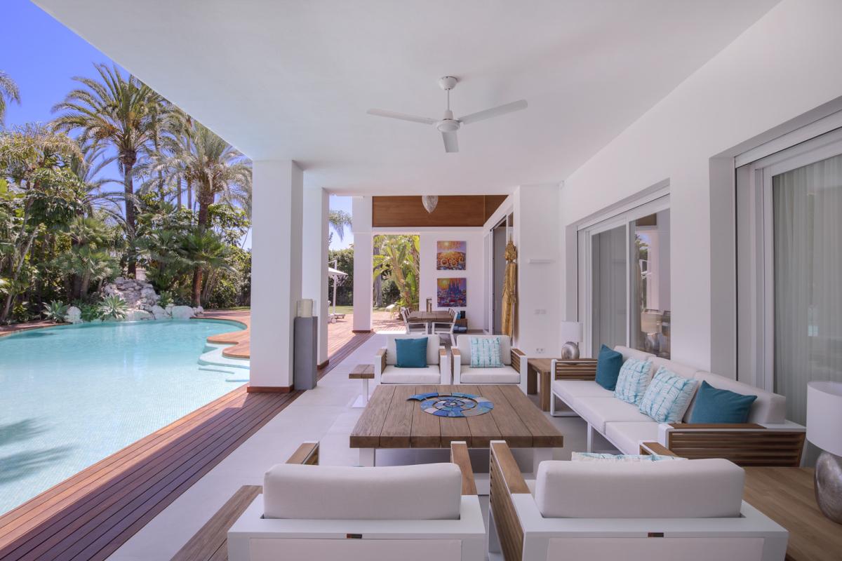 A secluded tropical oasis that starts to reveal itself once you pass through the impressive electric entrance gates. The Portuguese natural stone driveway adorned with tropical lush vegetation gives you the sensation that you have arrived at a home where no attention to detail was spared in its complete refurbishment to create a truly magnificent one-of-a-kind. This is not just another modern white box, nor is it a traditional Andalusian home but rather combines the very best of modern design with the warmth and texture of natural materials with extensive use of wood, plants, water features, glass, and stone to give a unique atmosphere unlike anything else in Guadalmina.