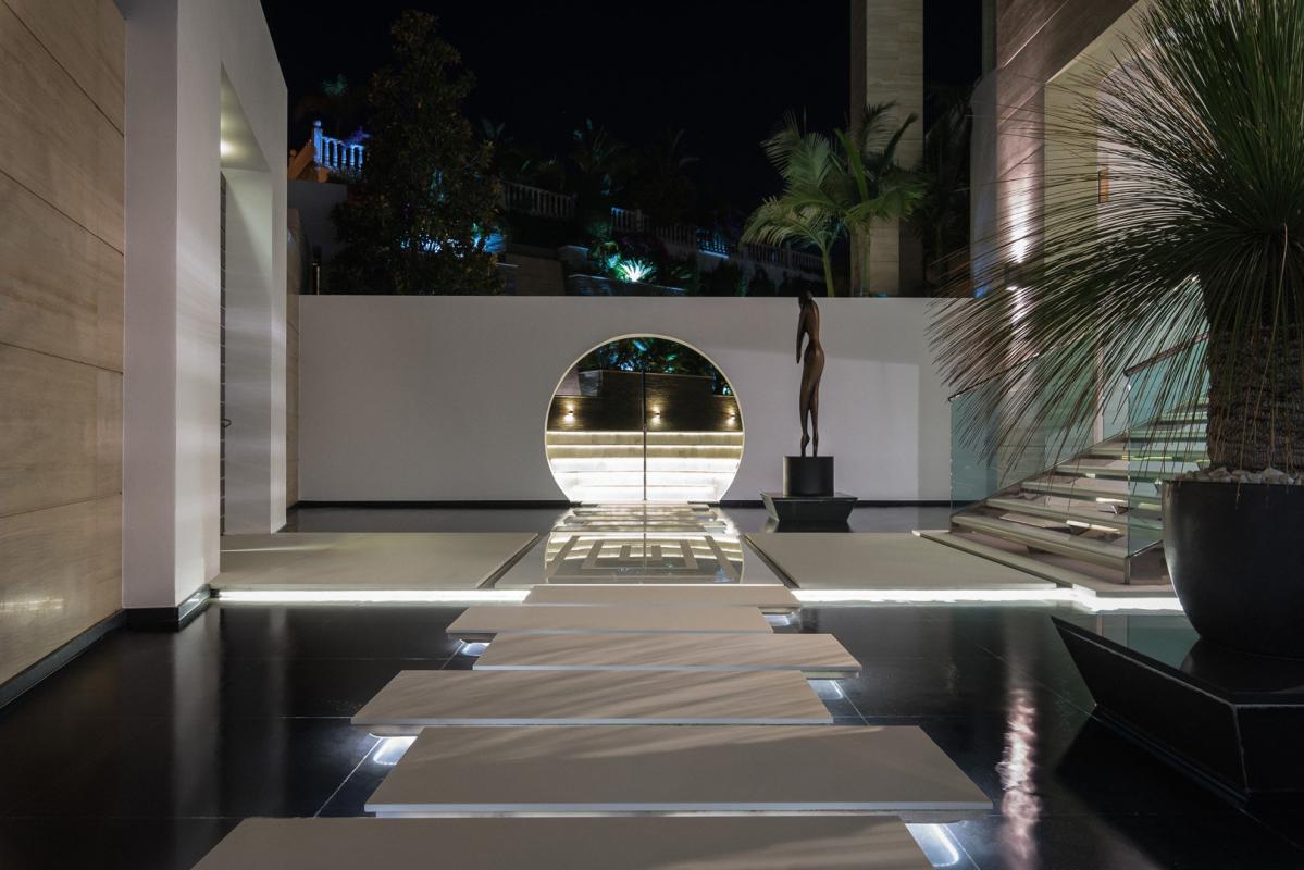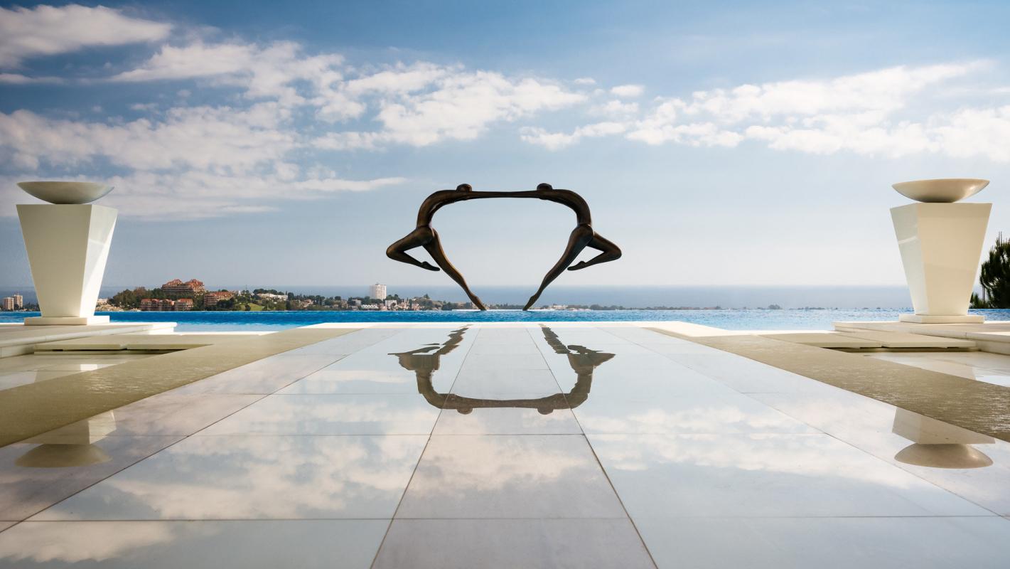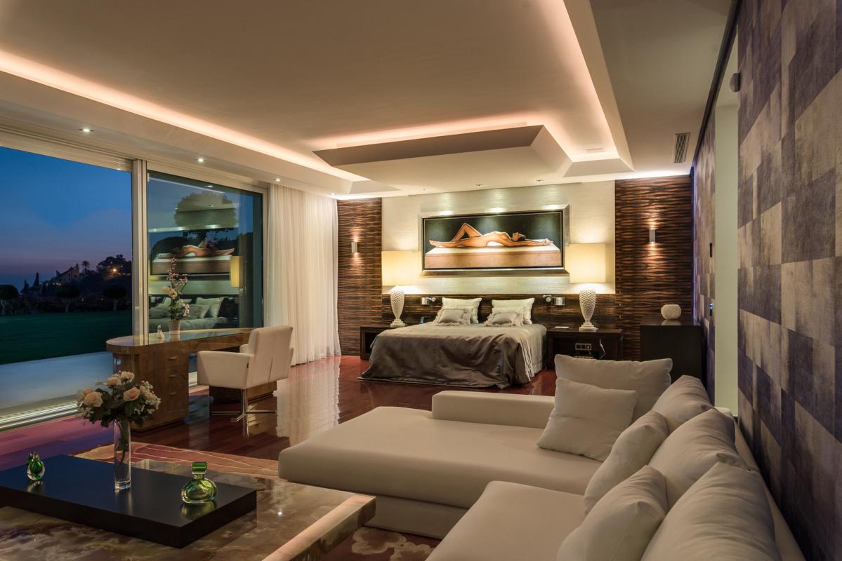 The villa is entered walking over water with some marble pathway already seeing some wonderful bronze statues, part of the theme throughout the house. Up some steps into the main hallway and you look out over the external pool and a specially commissioned statue that dominates the skyline. The six bedroom suites are on this middle floor. Of which there is one junior master suite and the main master being 120 m2, giving access to the terraces and garden with more bronze art work and sculptured olive trees from the main suite. Each has wooden floors, many wardrobes and either jade, onyx or marble bathrooms.