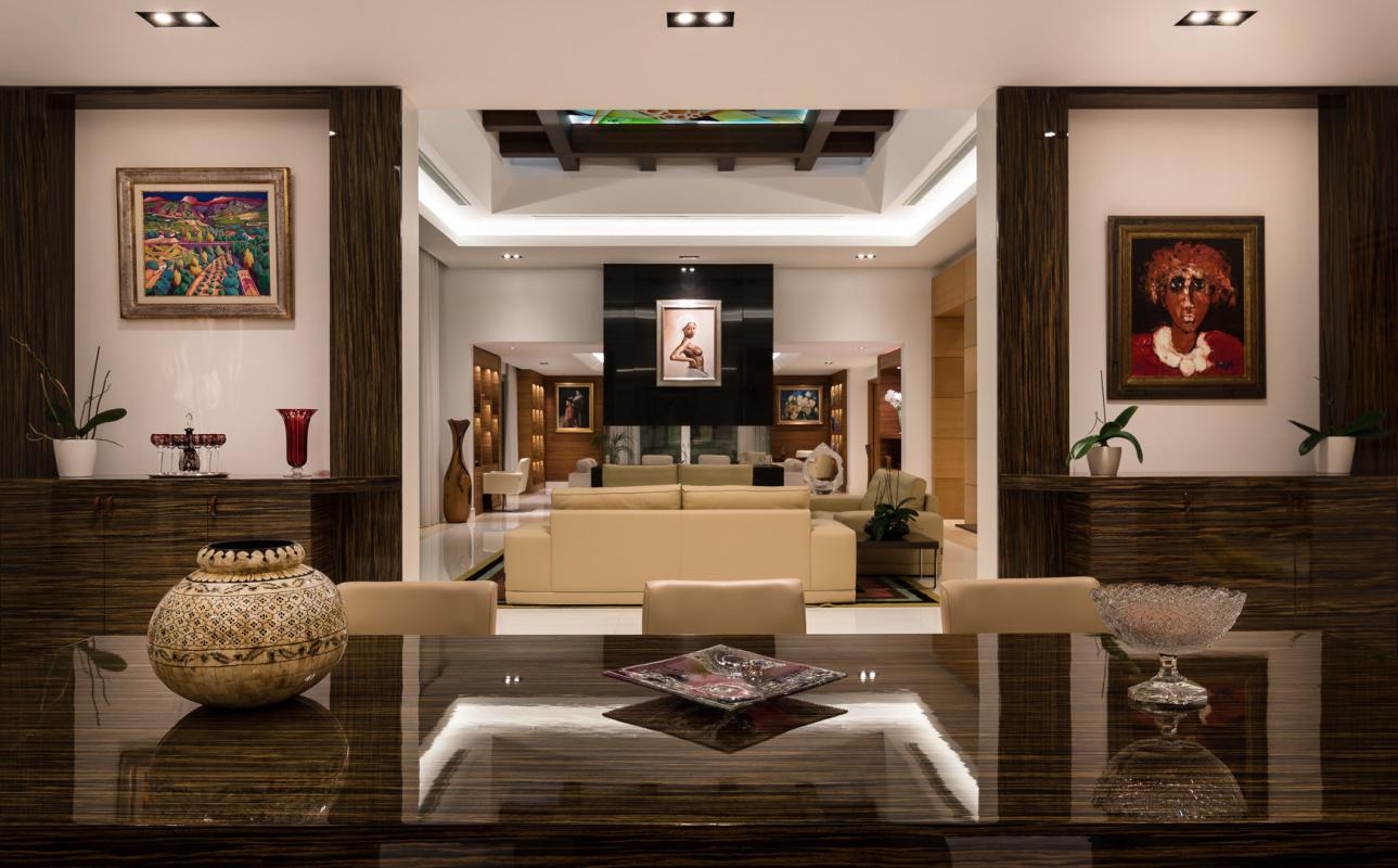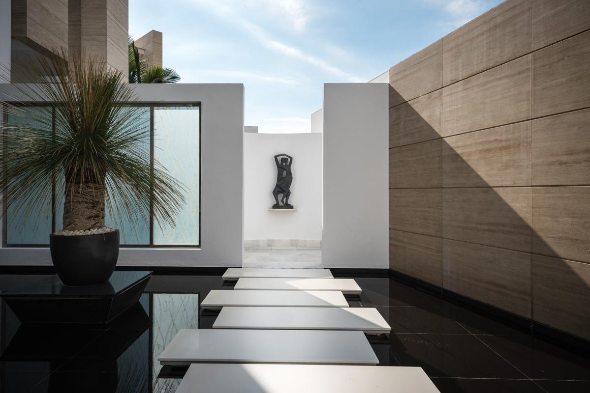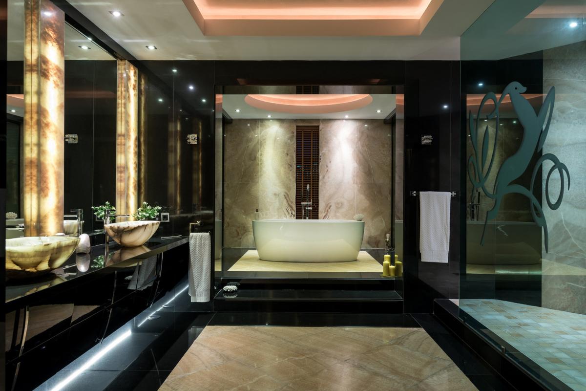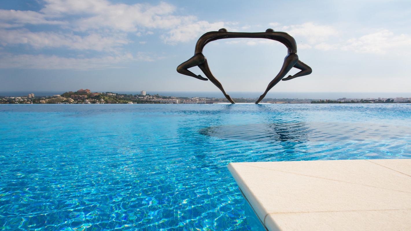 The villa is entered walking over water with some marble pathway already seeing some wonderful bronze statues, part of the theme throughout the house. Up some steps into the main hallway and you look out over the external pool and a specially commissioned statue that dominates the skyline. The six bedroom suites are on this middle floor. Of which there is one junior master suite and the main master being 120 m2, giving access to the terraces and garden with more bronze art work and sculptured olive trees from the main suite. Each has wooden floors, many wardrobes and either jade, onyx or marble bathrooms.