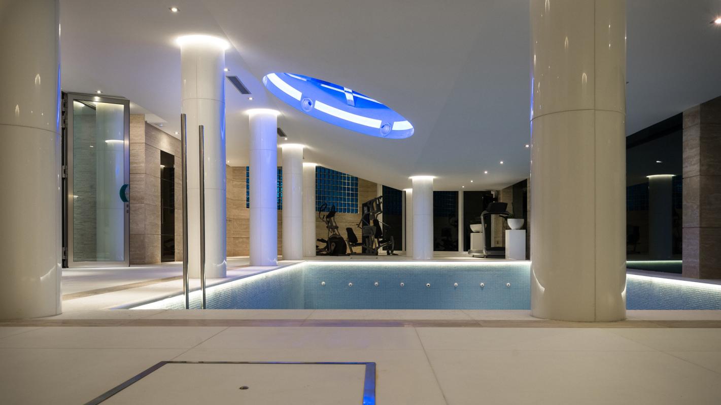 On the lower floor is the internal swimming pool, sauna, gym and shower rooms with windows overlooking the landscape and an oval window looking up through the upper pool to the upper level statues.