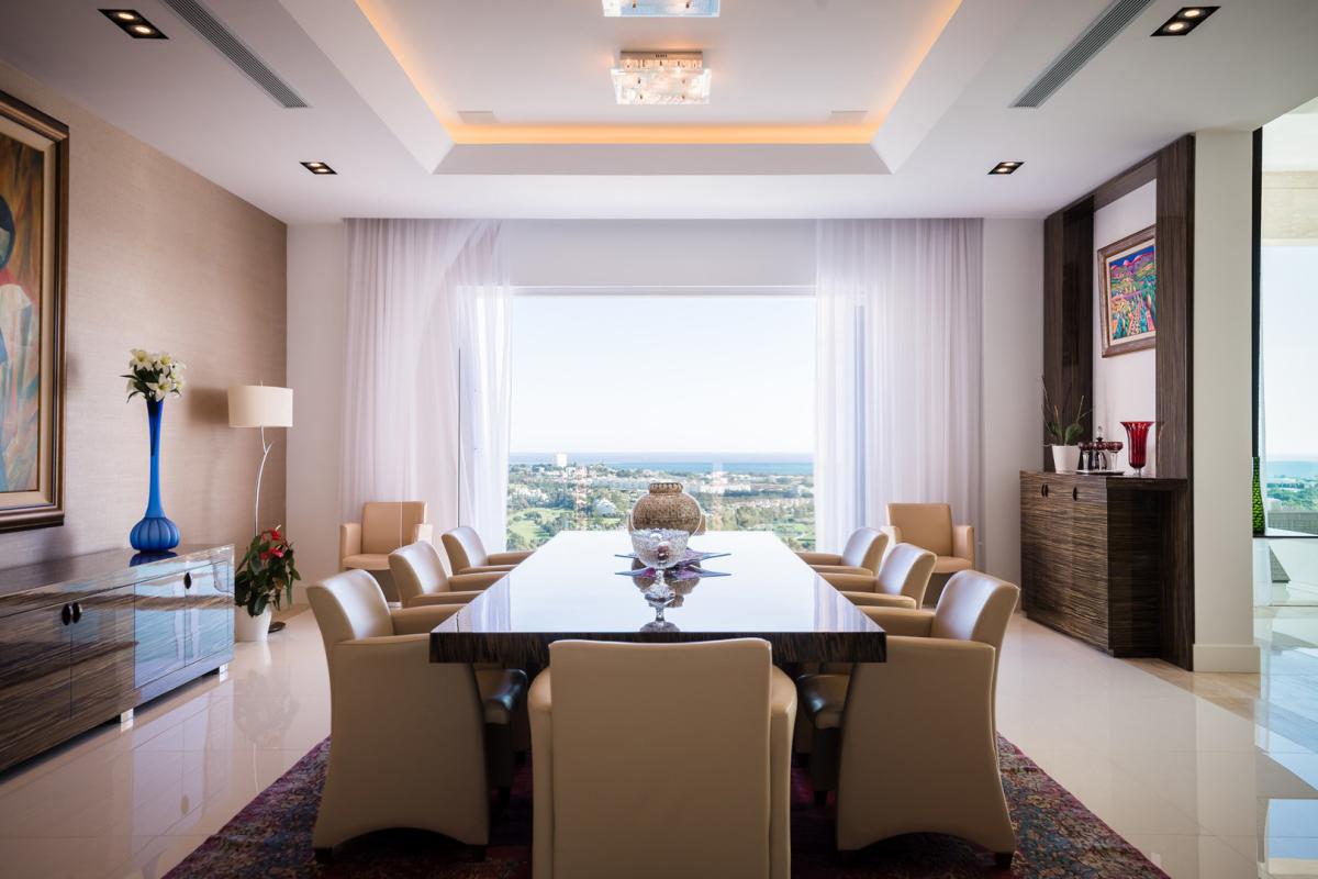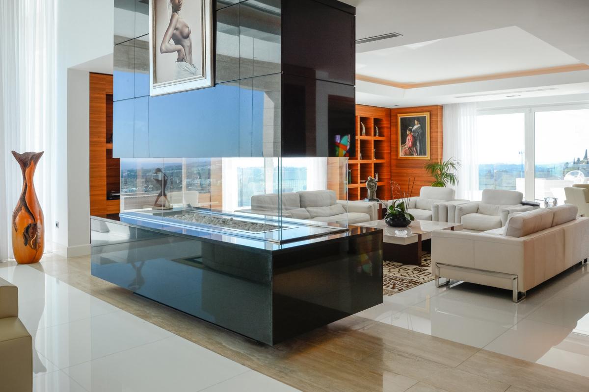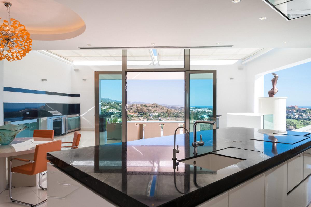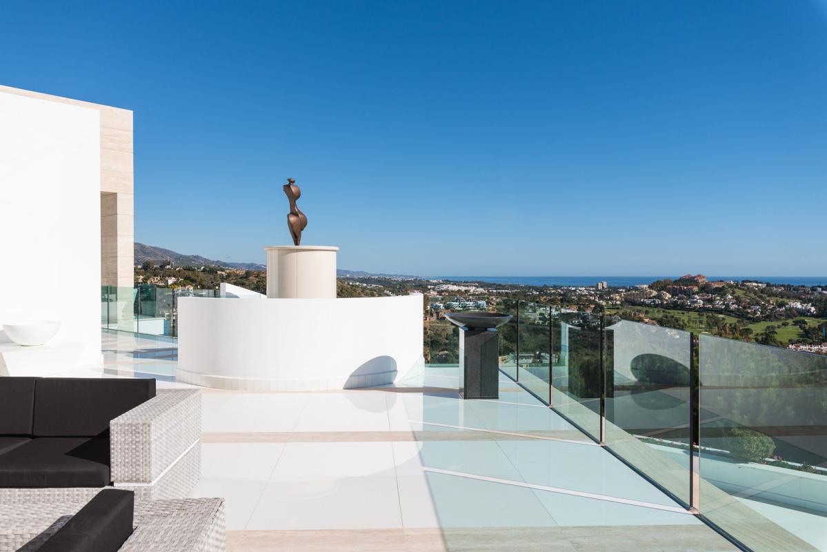 All floors are accessed by elevator and several large spiral staircases with the top floor having a big modern kitchen and terrace with outdoor eating and BBQ area overlooking the golf valley. A separate dining room used at present for 8 people, again with terrace and magnificent views. The two very large sitting rooms, the main with stained glass ceiling which are divided by a contemporary fire-place giving different zones and both connecting to the extensive terrace, again all with spectacular views. There is beautifully crafted etched glass semi-circular wet bar with onyx floor close to the main salon. The wrap around terrace leads out to another enormous terrace half covered for outdoor life and contemplating the sunset.