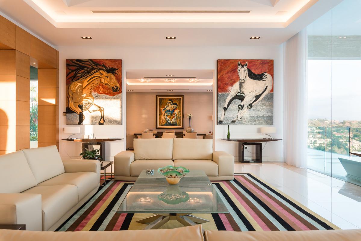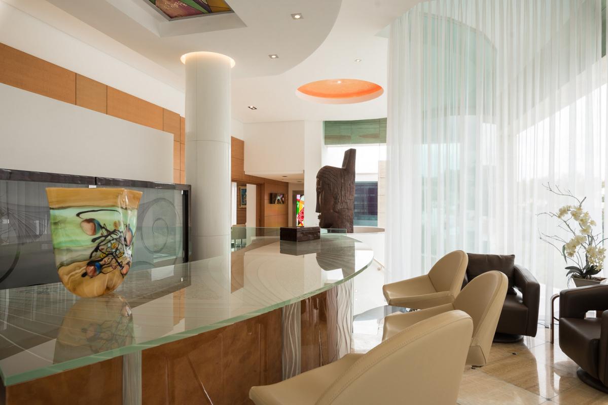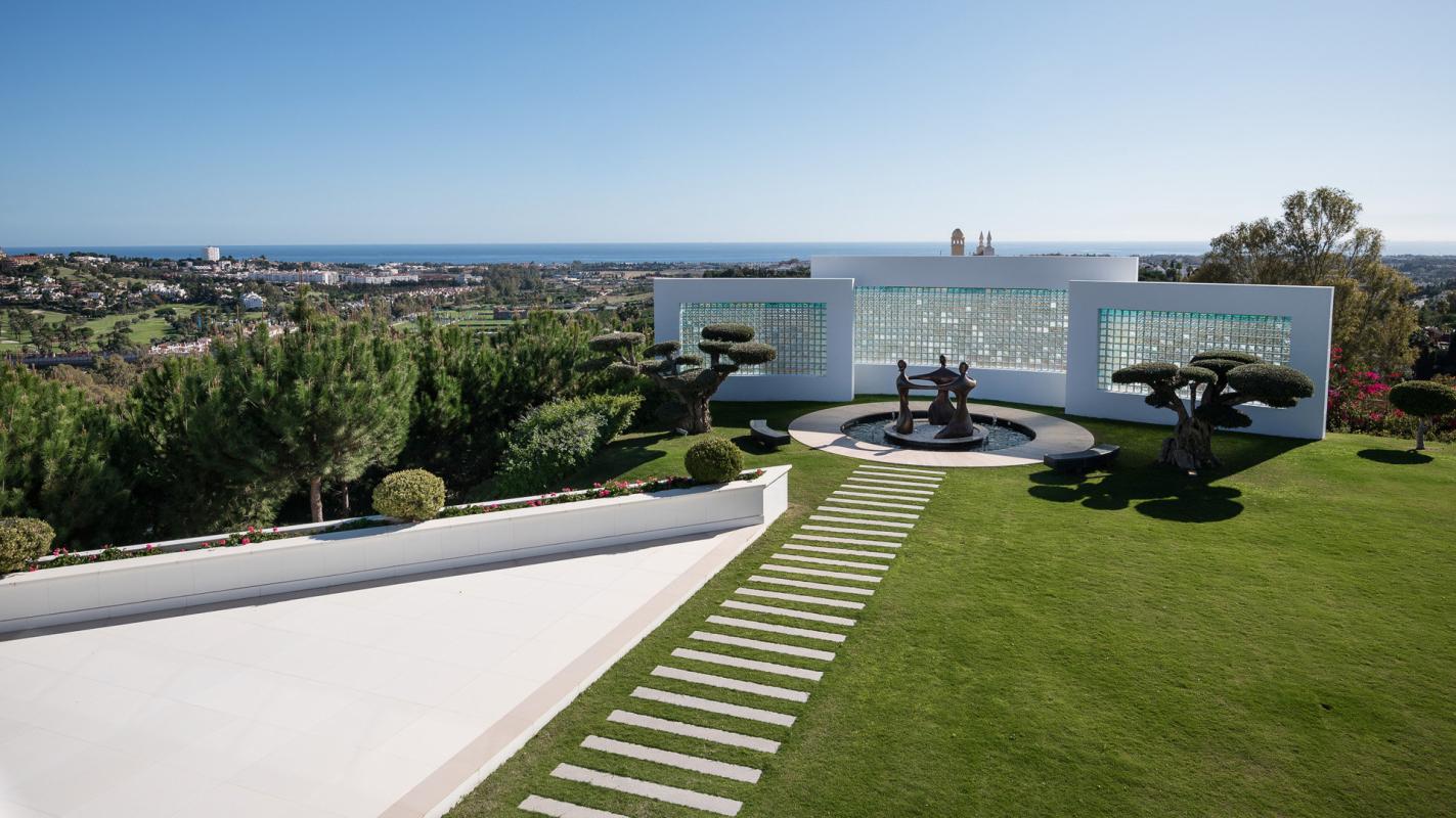 All floors are accessed by elevator and several large spiral staircases with the top floor having a big modern kitchen and terrace with outdoor eating and BBQ area overlooking the golf valley. A separate dining room used at present for 8 people, again with terrace and magnificent views. The two very large sitting rooms, the main with stained glass ceiling which are divided by a contemporary fire-place giving different zones and both connecting to the extensive terrace, again all with spectacular views. There is beautifully crafted etched glass semi-circular wet bar with onyx floor close to the main salon. The wrap around terrace leads out to another enormous terrace half covered for outdoor life and contemplating the sunset.