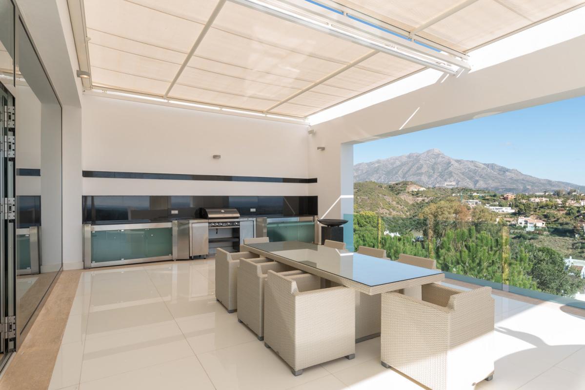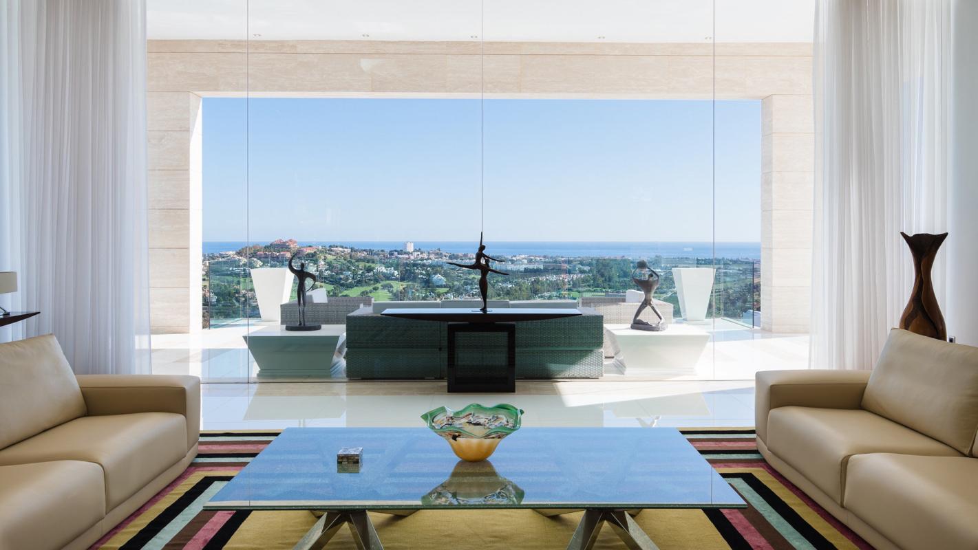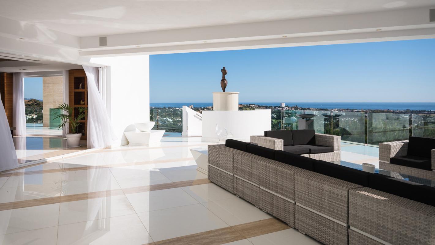 A truly spectacular contemporary house with exceptional qualities and finishes in a golf estate with 5 Star Hotel and Club house. The villa is on 3 floors at the top of a hill to give 300 deg views with magnificent mountain and sea views all along the Spanish coast and to the west, to Gibraltar and even the Moroccan coast with the Rif Mountains on the many clear days.